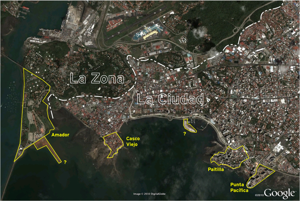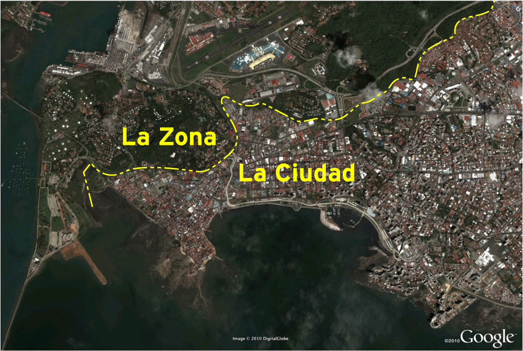 La ciudad bipolar. Si bien la famosa frontera entre la ciudad panameña y la (antigua) zona del canal, esa línea de la que los viejos nos acordamos y que seguro hasta los jóvenes ven en sus clases de urbanismo, lleva diez años terminándose de disolver, aún es muy visible desde el aire. En el límite, que corre por la avenida de Los Mártires y el río Curundú, se enfrentan dos condiciones fondo-figura opuestas: un lado es gris con lunares verdes, urbano y denso; el otro es verde con lunares grises, suburbano y disuelto.