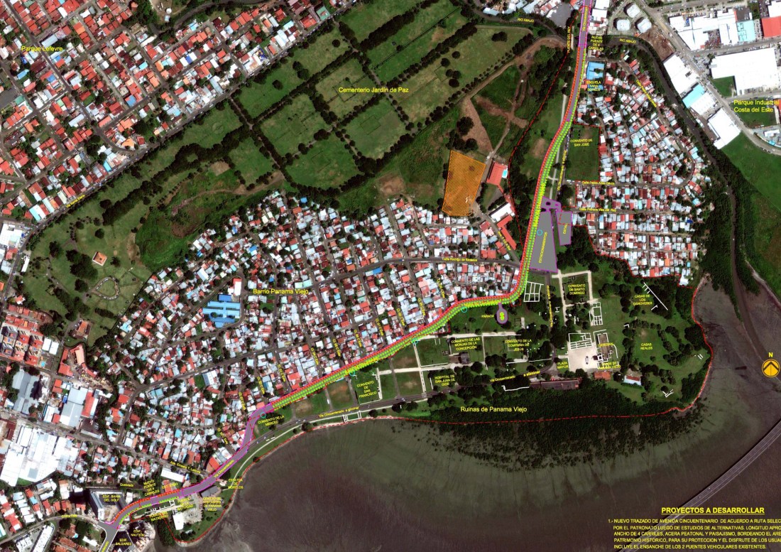 - Reubicación de la vía Cincuentenario a la altura de Panamá Viejo y su ensanche a 4 carriles. Los postores deberán proponer una solución que permita retirar el tráfico actual por el sitio Patrimonial de Panamá Viejo. Incluye el ensanche de los puentes existentes en la Qbda Santa Elena y de Rio Abajo.