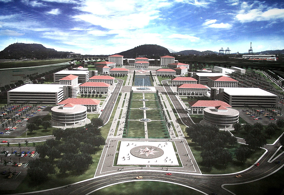 Arriba, el antes (i.e. un render de la ciudad gubernamental de C.A. Clement & Sons Designers, fechado 2001, proyecto planchado por el MEF después que La Prensa publicara los detalles); abajo, lo que aparentemente es el ahora (fide nuestras fuentes usuales). Menos Speer, más Astroboys. Se aprecia el nuevo tribunal electoral y el nuevo Curundú, pero lo que más nos emociona es el pedazo adicional de MultiAlbrook Mall!!!!!!!!!