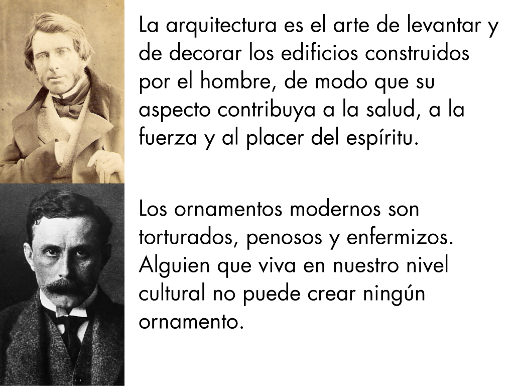 Por siglos el ornamentar fue parte esencial de la arquitectura, al punto de ser señalado por Ruskin como lo que la diferenciaba de la mera construcción. Naturalmente, la siguiente revolución arquitectónica consistió en renegar de estos principios. En su excelentemente entitulado ensayo Ornamento y delito, Loos lauda los productos limpios y sencillos de la modernidad y sostiene que hacer decoraciones es trabajo de culturas inferiores, polinesios, niños y criminales. Tenemos un mandamiento nuevo: no ornamentarás.