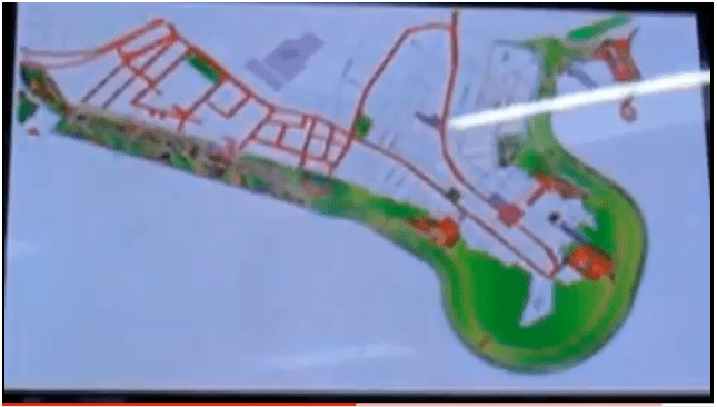 “Aquí tendríamos una vista panorámica de cómo quedaría finalmente el relleno de la opción B.” [Los rectángulos anaranjados esos entre los verdes prados son plazas de estacionamientos].