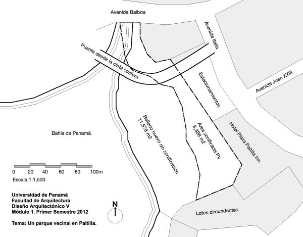 Descripción del proyecto con el programa de diseño: El objetivo académico principal es aprender a diseñar un espacio público de uso variado, pero respondiendo al contexto urbano existente: un sitio altamente visible entre la densidad de Paitilla y la serenidad del mar.