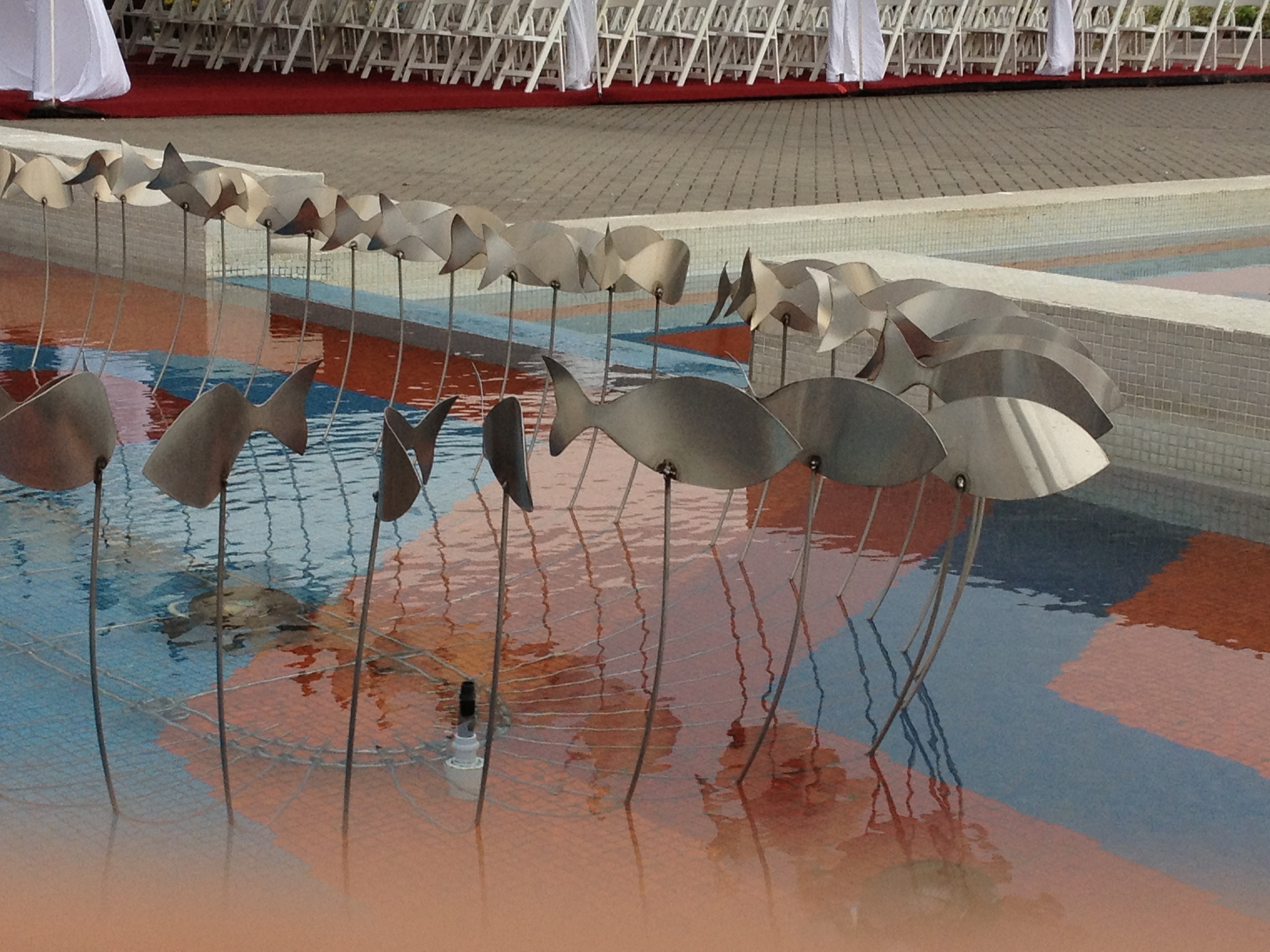 La pieza principal de metal dispone de su punto más alto con una elevación de 8.0 metros y 3.5 metros de ancho. Mientras que la pieza secundaria (horizontal) consta de 46 piezas con figura de peces arqueados, saliendo de un chorro de agua. Dispone de 1 metro de altura y una longitud de 3.8 metros, inmerso en la fuente de agua.