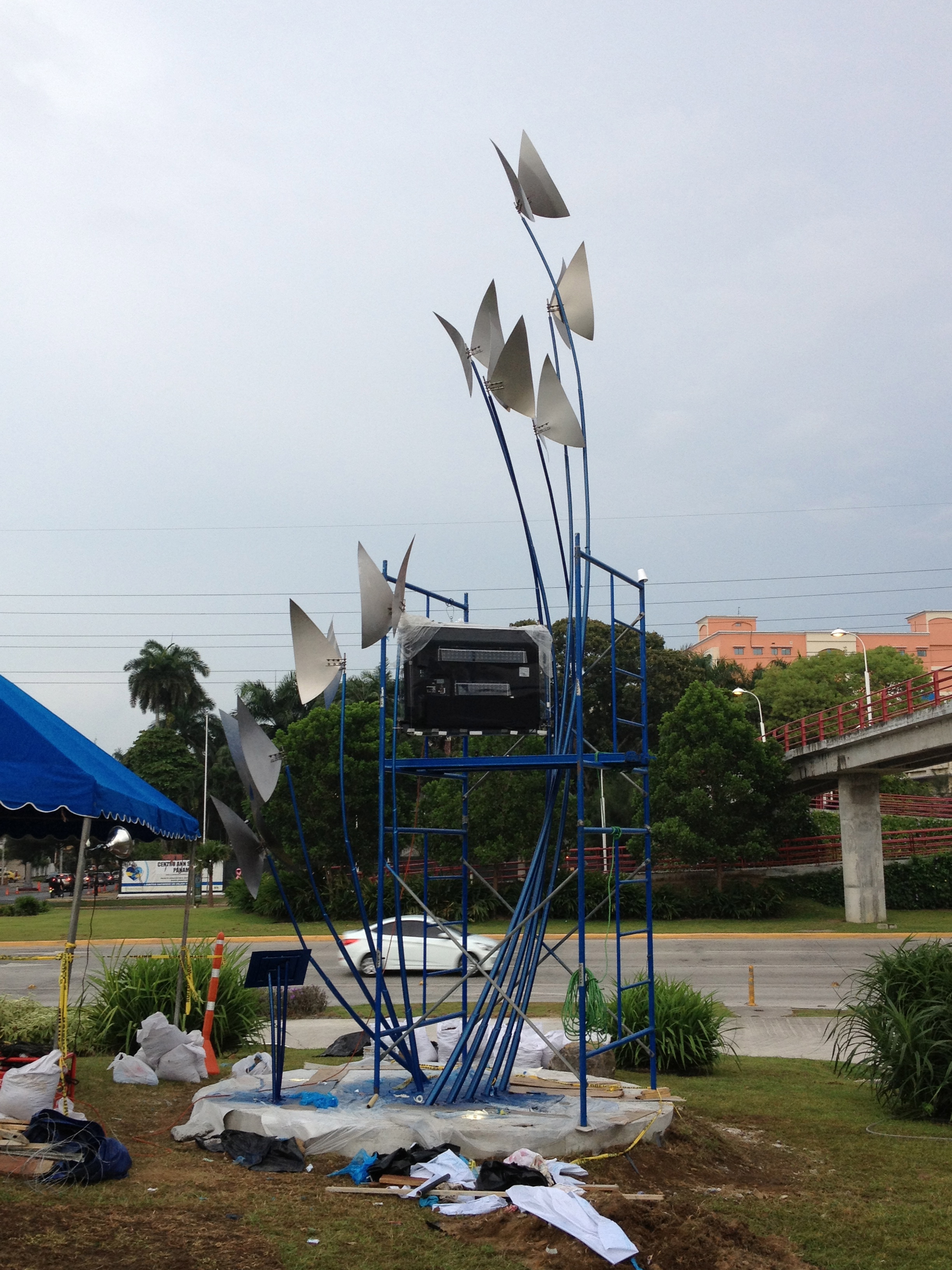 El conjunto es, en pocas palabras, una sinfonía en lámina metálica y punto de soldadura. Lamentablemente, tememos que el andamio, tal azul y tan metálico como las astas de las mariposas, será retirado antes de la inauguración. Mi parte favorita era el vasito de foam de arriba. Abajo a la izquierda, el podio escultórico para la placa, que es la parte más importante de todo monumento.