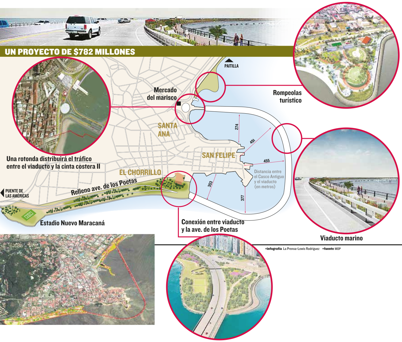 En los últimos diseños divulgados por el MOP […] se aprecia un cambio respecto a la propuesta original. El viaducto marino no conectará directamente con la avenida Balboa. Llegará a la segunda fase de la cinta costera, entre el Mercado del Marisco y el Casco Antiguo, lugar donde se construirá una glorieta para distribuir el tráfico.