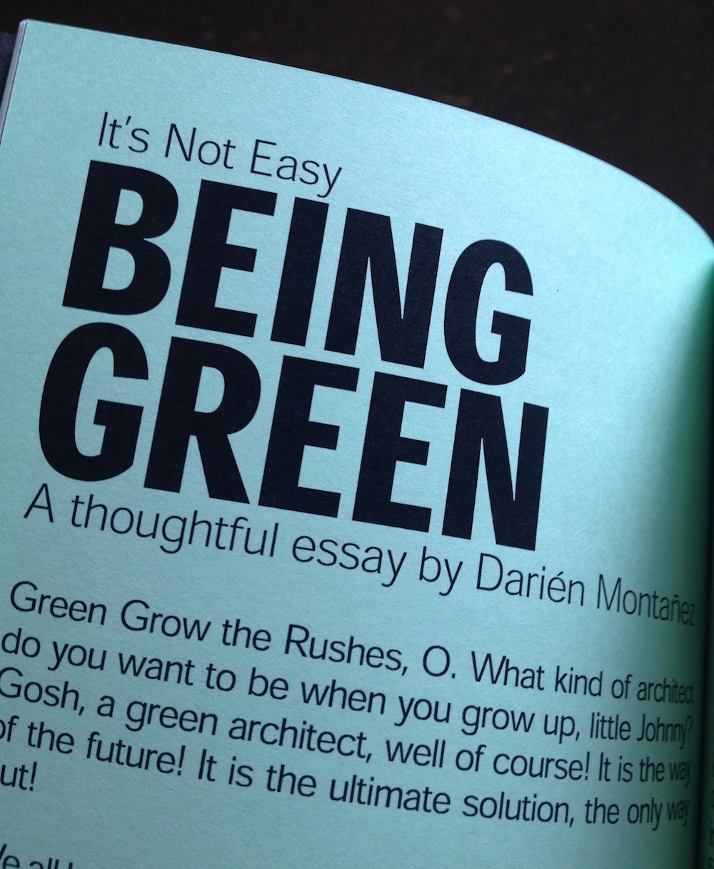 Pues mi propia copia tangible me llegó en el correo ayer y oh que si es una cosa bella. Táctil y texturizada tipografía en el más violento verde flúor sobre un fondo negro papel de construcción, y adentro un popurrí de hojas full color satinado tiro y retiro y en una tinta sobre papel verde menta. Si yo fuera ustedes estaría apretando BUY NOW es ahora mismo. Por si no están convencidos, todo el volumen está ojeable gracias a la magia del issu.