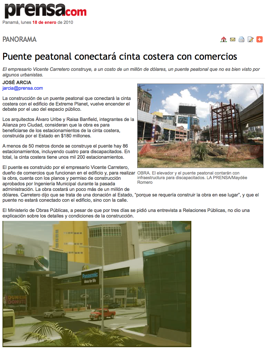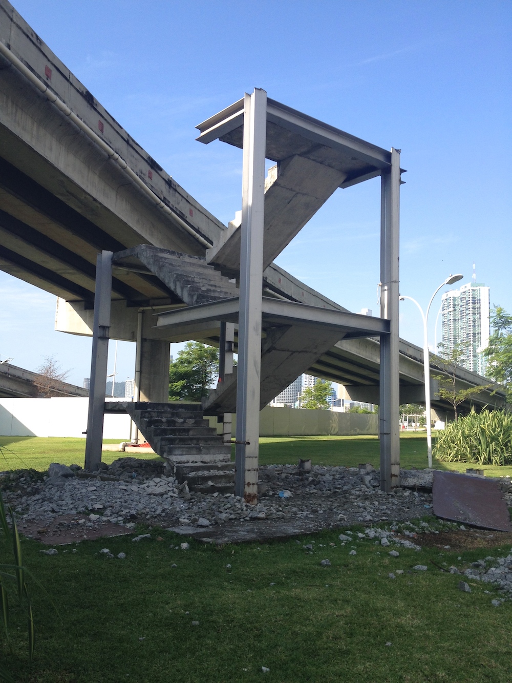 En tierra de ciegos, el tuerto es rey. Las áreas verdes del frente marino de la cinta costera son muy populares, y son utilizadas por corredores de mañana y tarde y familias en fin de semana. Pero las del otro lado de la vía, en la isleta que la separa de la avenida Balboa, son tierra de nadie: una serie espacios residuales terriblemente subutilizados. Particularmente interesantes son las que están al extremo este de la cinta costera, adonde alrededor de una playa de estacionamientos se levanta una serie de monumentos que nadie aprecia, incluyendo piezas de infraestructura del sistema de saneamiento de la bahía y las ruinas del puente del extinto Extreme Planet.