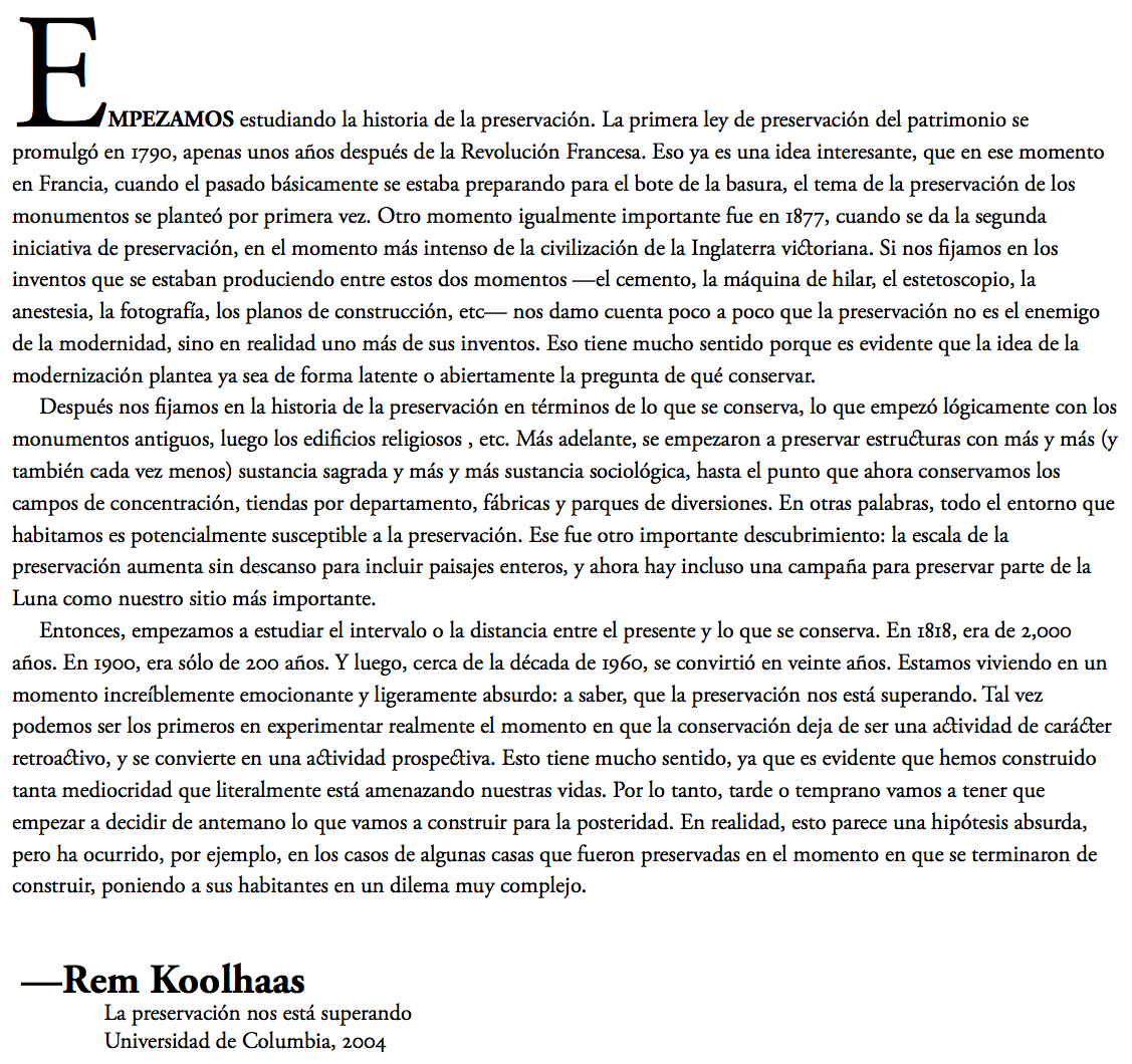 Regresando a lo que nos atañe, ¿qué voy a poner a hacer a mis (des)afortunados estudiantes? Pues un proyecto que he entitulado “Puesta en valor, restauración y reutilización adaptativa de los monumentos del extremo este de la cinta costera.” Remitámonos al syllabus, que empieza con la obligatoria cita de Koolhaas: