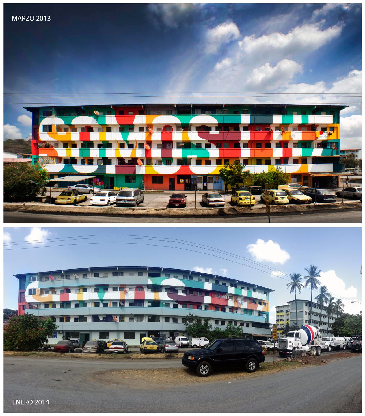 La buena noticia es que parece que están empezando a terminar de desmontar la I Bienal del Sur en Panamá (sic). La mala es que están destruyendo una de las pocas intervenciones bonitas pintándola de un blandísimo e institucional gris. Señores, nos gobiernan los Blue Meanies.