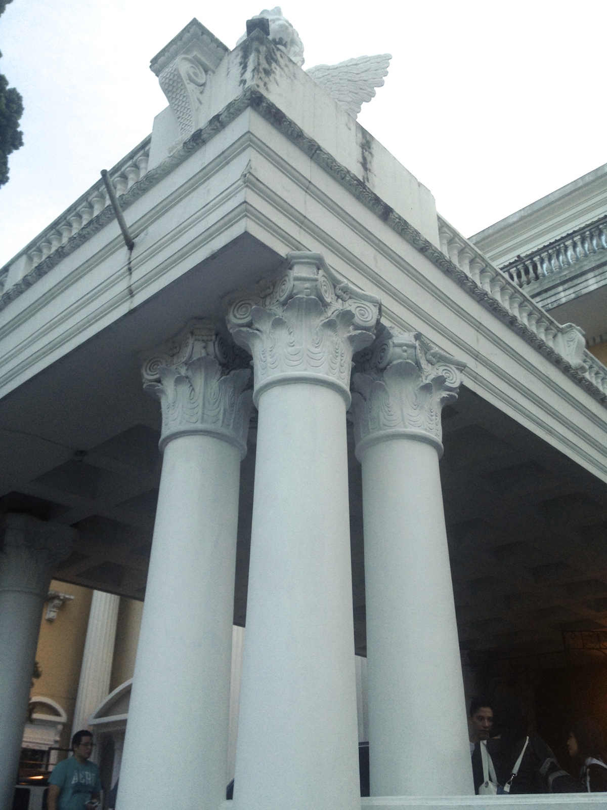 Shucocó, medio modernista-medio art deco, cuasijónico con rabos de puerco. Afinaciones Israel, si sólo nuestro George Bush hubiera sido dentista! El estribillo es la muela [feliz]: hay bancas maxilares con los correctos 16 dientes. Dos medios bustos de Nerón inexplicamente insertos en las paredes. Las columnas toscanas valientemente atraviezan y superan el entablamento! La fachada de terracota tiene siete luces y 1/2. Un hotel octasilo y medio fíjese usté, porque el chapín también sufre del flagelo del horror vacui. Dinero, amateurismo y eclecticismo: combinación explosiva, mitad gingerbread victoriano, mitad altar churrigueresco. Ardillas y estrellas; vides y bellotas; conchas y volutas. Qué más? Ostentación, ornamentación y desorientación. El colonial centroamericano es con gótico y con romántico y con repostero. Más halucinante a medida que se asciende. Así, más es más. Las ménsulas no soportan nada. La Toya de Samotracia (oculta tras un chandelier).