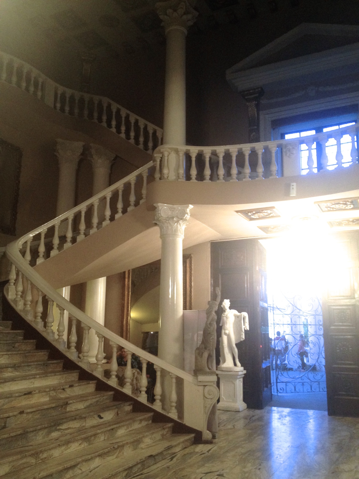 Y los interiores… ¡esos interiores! Si por fuera el teatro es una caja decorada, por dentro es un delirio de ornamentación clasicista/barroca/manierista/povera. Mármol, columnas, frontones, curvas, curvas, curvas. Y esculturas, todas muy taquilleras, por doquier.
