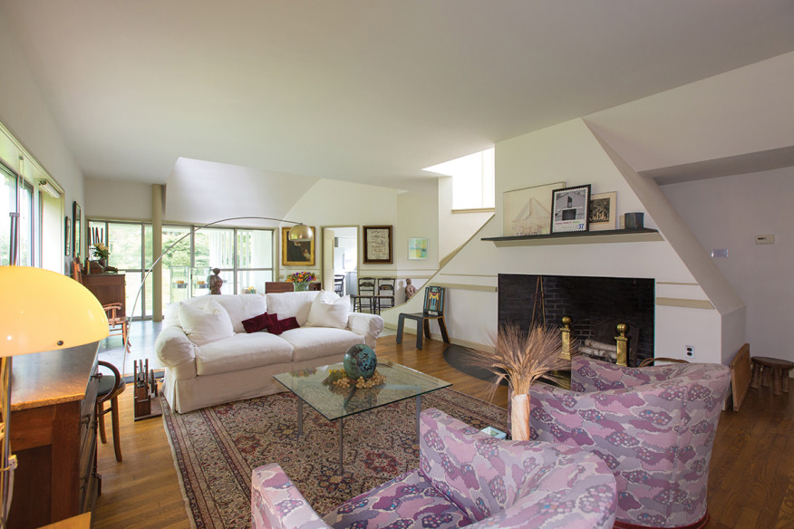 Pero vamos a lo que importa: los interiores. Primero el vestíbulo y escalera/chimenea, con una silla Sheraton de Venturi para Knoll (que ojalá venga incluida en el precio de la casa).