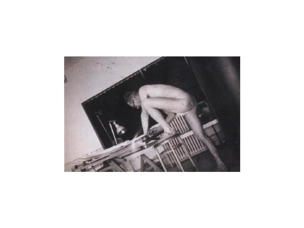aunque para pintar prefería estar como dios lo trajo al mundo. Nótese la cicatriz en la pierna, producto de una hélice de un yate que le pasó por encima mientras nadaba en la bahía de Saint-Tropez en 1938 y le dejó “medio muslo flotando como una raya (¡el pez!) colgando de una estrecha tira de carne.”
