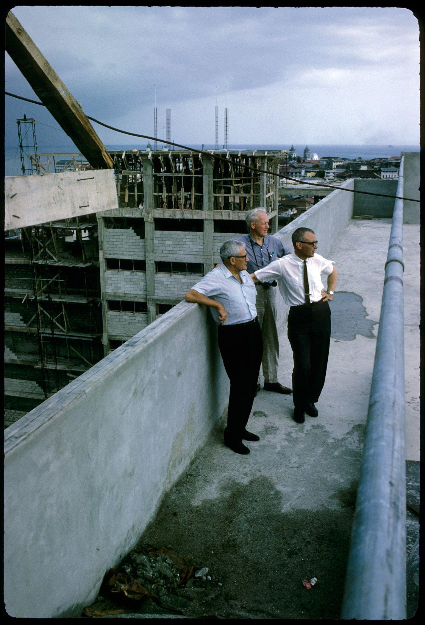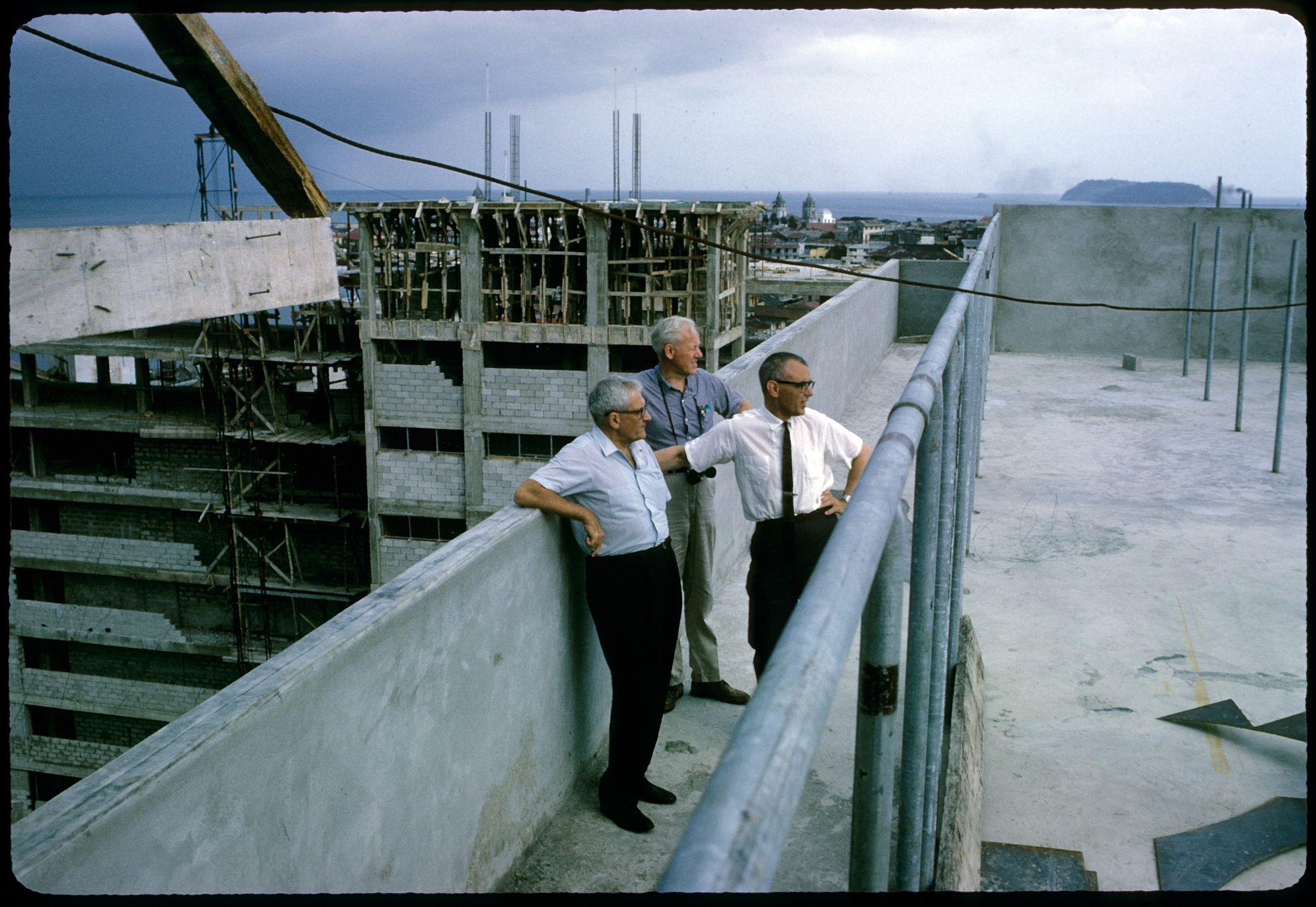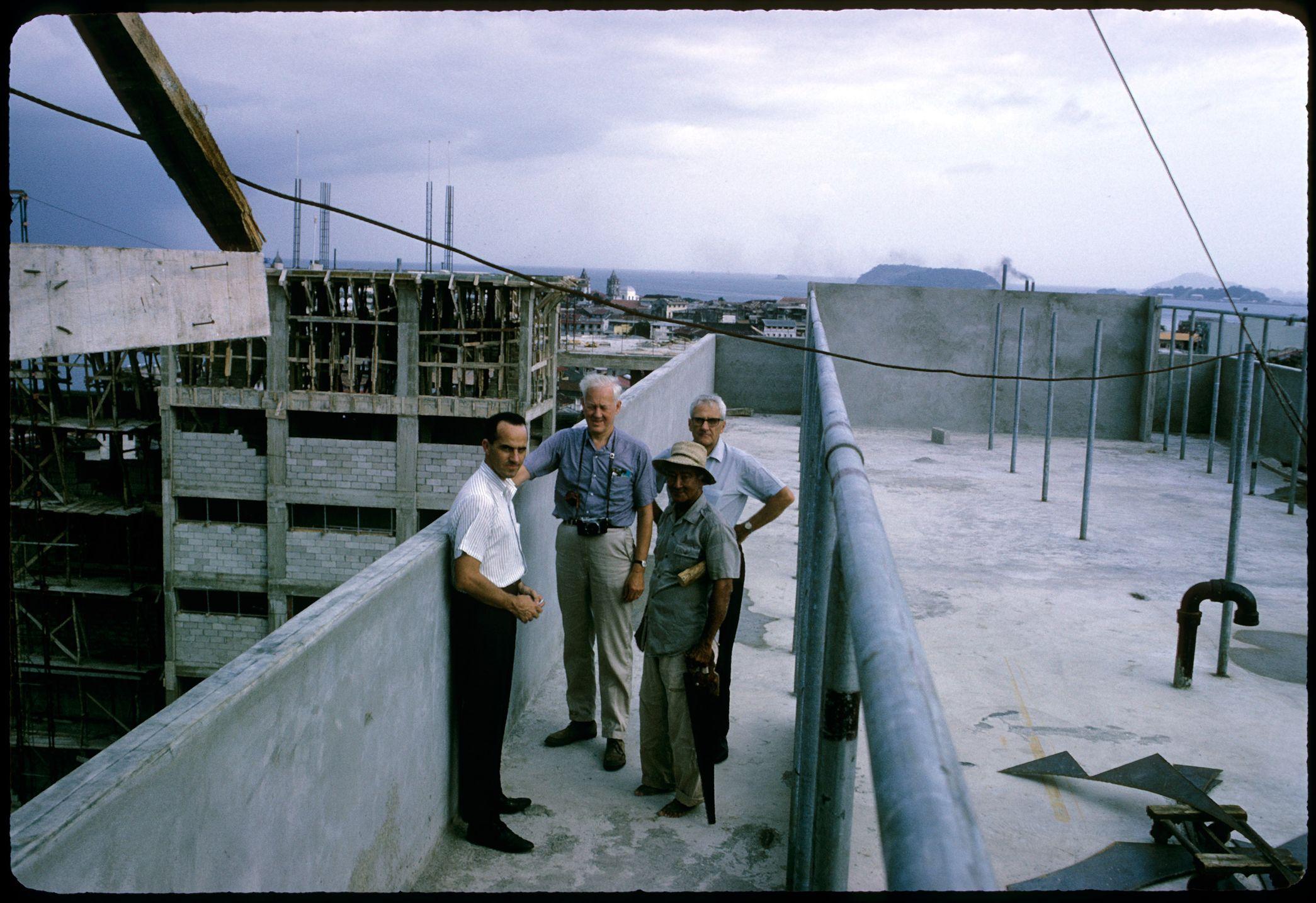 Y cerramos con unas fotos tomadas desde la azotea de las multifamiliares de la Avenida B, un proyecto del Instituto de Vivienda y Urbanismo y que se completarían en 1965. Ahí aparece Currie, acompañado de un arquitecto (¿o decano?) Bowden, un arquitecto Cornwell (o Cornwall), y otras dos personas no nombradas. Nótese en el fondo las vetustas torres de la Catedral y el resplandeciente domo del Palacio Municipal.
