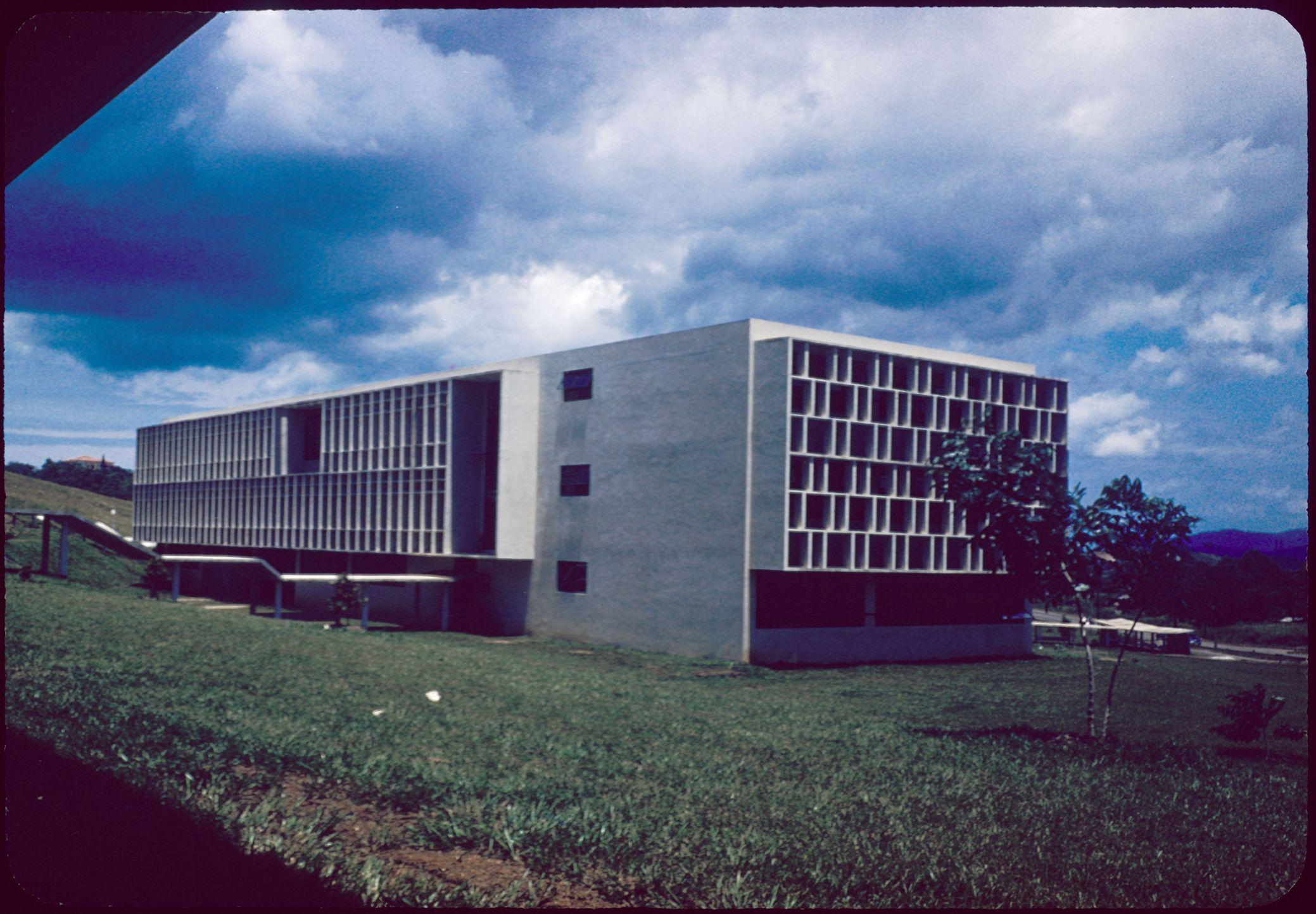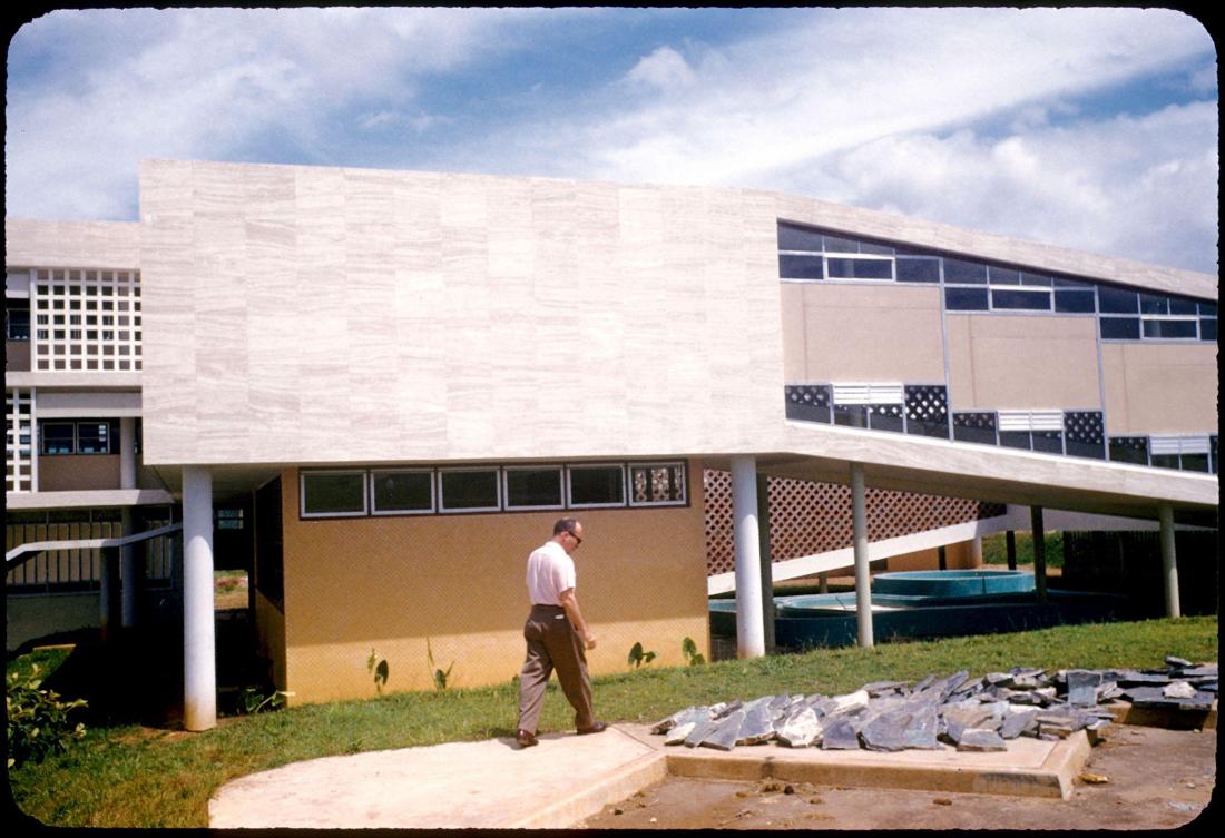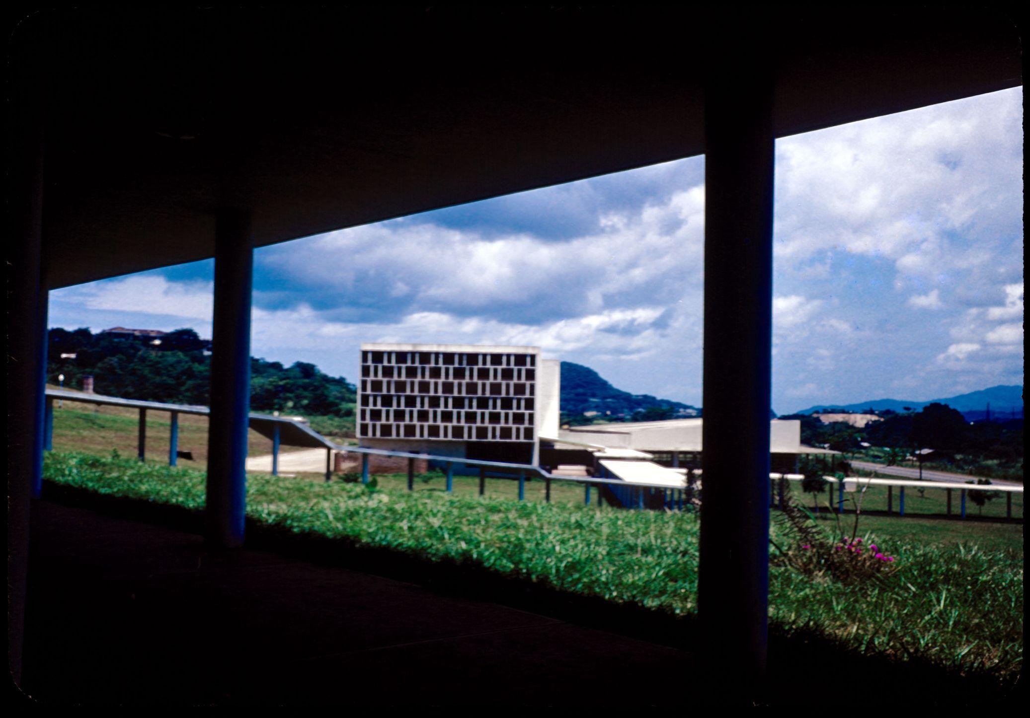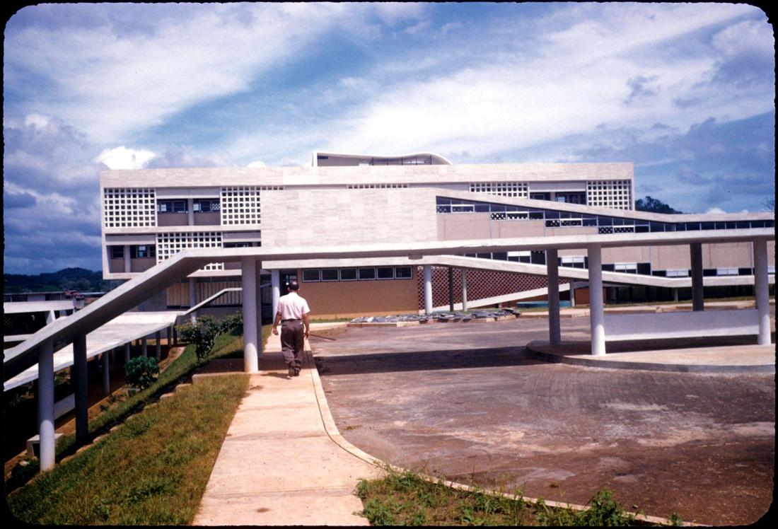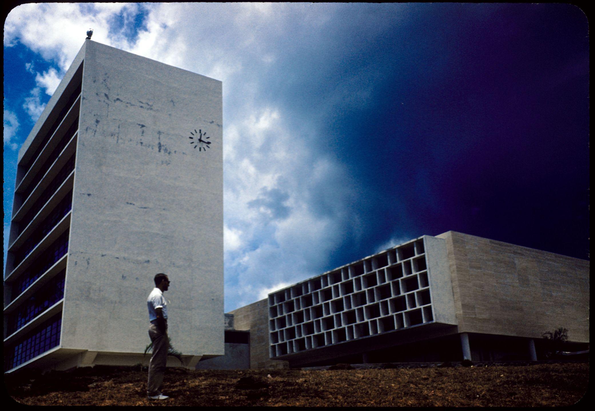 Ya pasando a las diapositivas tomadas en 1956, regresamos a la Universidad de Panamá, esta vez para ver el anexo a la Facultad de Ciencias (de Roux, Bermúdez y Brenes, 1960). Mírenme todos esos detalles corbusianos y esos materiales y acabados nobles y diversos. En esta visita, el anfitrión fue el mismo Ricardo Bermúdez (identificado gracias al colega Héctor Ayarza, experto en all things Ricardo Bermúdez).