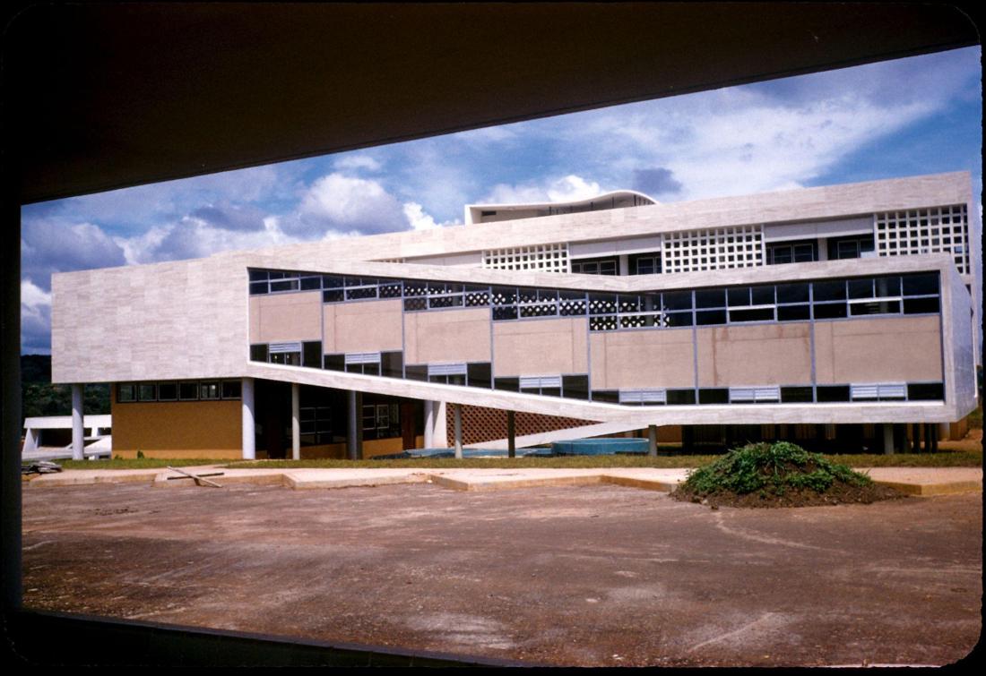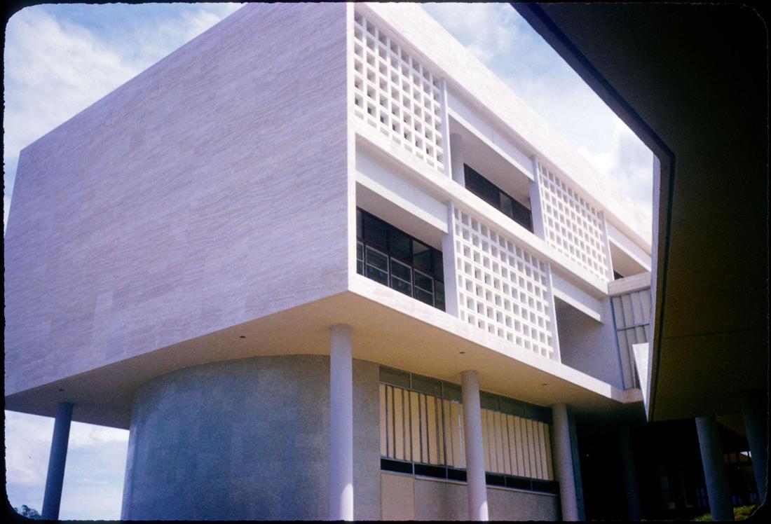 Correcto: es la biblioteca del Campus de la Universidad de Panamá, de Ricardo Bermúdez, Guillermo de Roux y Octavio Méndez Guardia, inaugurado en 1950. Mírenme esos revestimientos en travertino finísimos que juegan sabios, correctos y magníficos bajo la luz tropical. Y no se pierdan los photobombs de nuestro anfitrión, Guillermo de Roux.