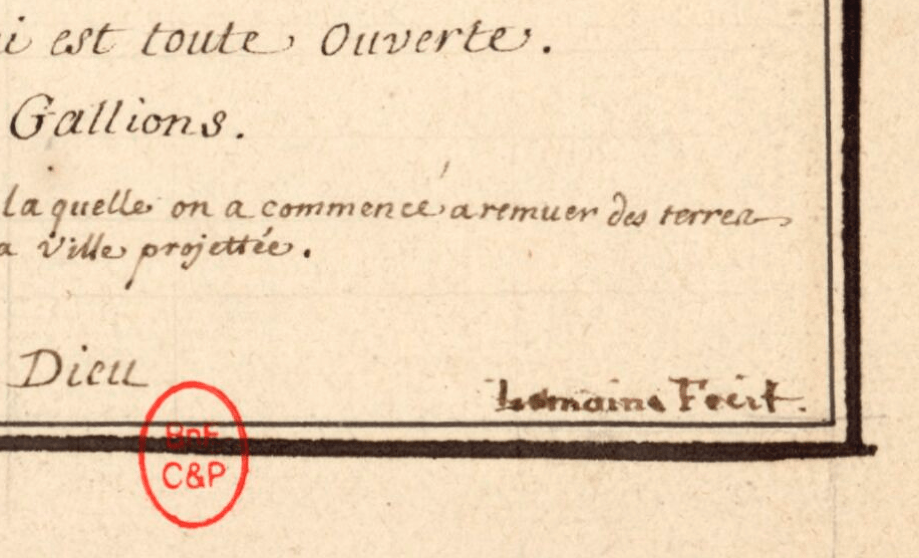 Como las cosas nunca son fáciles, ninguno de los dos planos tiene fecha, aunque la BnF estima que el suyo fue publicado entre 1740 y 1760, y los demás mapas del álbum de la LoC tienen fechas entre 1717 y 1744. Lo que sí tiene el mapa de la BnF es una firma. Redoble de tambores, s’il vous plaît:
