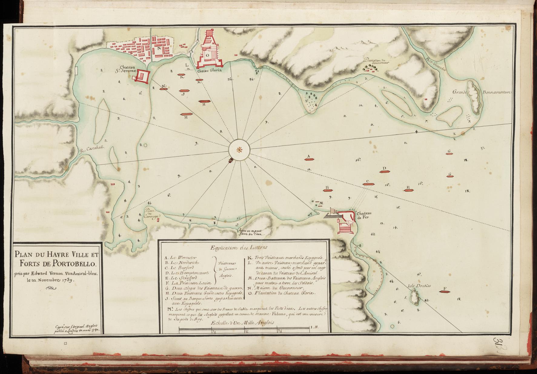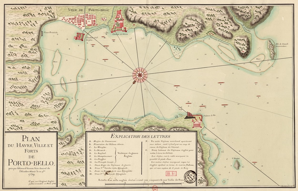 Seguramente todos ustedes ya están buscando otros mapas firmados por Lemoine, y la BnF tiene un montón, incluyendo este otro plano de la bahía de Portobelo, que es una copia de un original inglés publicado en Londres en marzo de 1740: